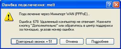 Когда вы нажимаете «Подключить», на сервер провайдера посылается запрос на авторизацию пользователя, и если запрос до сервера не «дошел», выдается ошибка 678 (на XP), 651 (на Win 7) или 815 (на Vista).